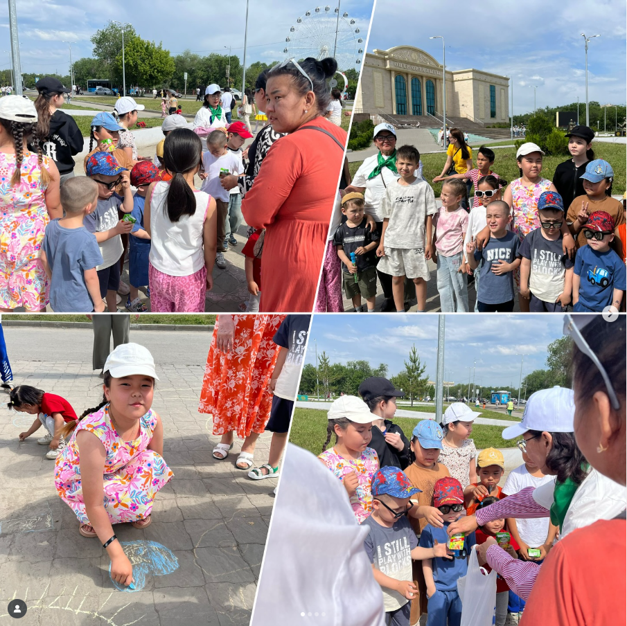 1 июня в Международный день защиты день детей на площади перед «Өнер орталығы» в целях раскрытия потенциала детей и повышения осведомленности родителей о ключевой роли семьи провели акцию «Қазақстан балалары». В ходе мероприятия организован конкурс рисунков на асфальте под девизом «Мир глазами детей!». Все детки получили подарки. Праздник детства удался на славу, рисунки радовали детей и всех прохожих.